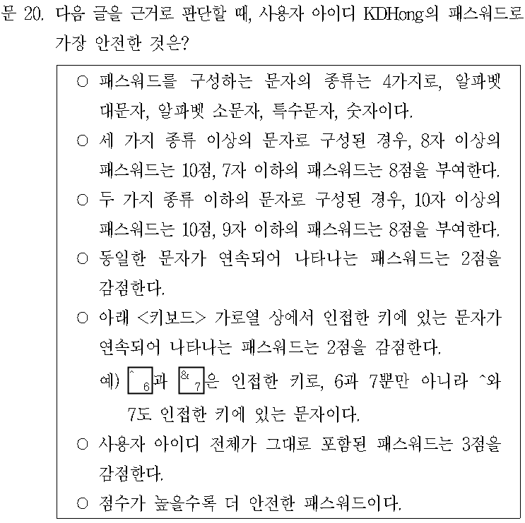 ② : 3종류의 문자, 7자이므로 8점, 사용자 아이디가 그대로 포함되었으므로 3점 감점 ∴5점