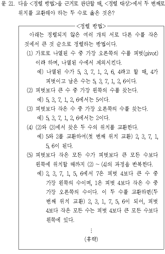 (2) 피벗보다 큰 수 중 가장 왼쪽의 수는 22이다.