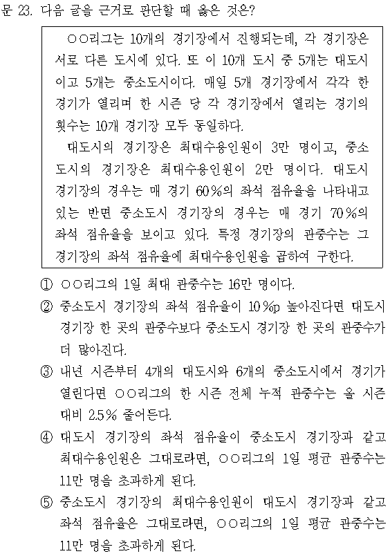 대도시 경기장의 좌석 점유율이 70%가 되더라도 1일 최대 관중수를 구해보면 다음과 같다. 한 경기장당 30,000 * 0.7 = 21,000명이고, 5경기가 모두 대도시에서 열려도 최대 21,000 * 5 = 105,000명이다. 즉, 평균이 11만 명을 초과할 수는 없다. (중소도시 경기장에서 경기가 열리게 되면 오히려 총합이 105,000명보다 작아지므로.)