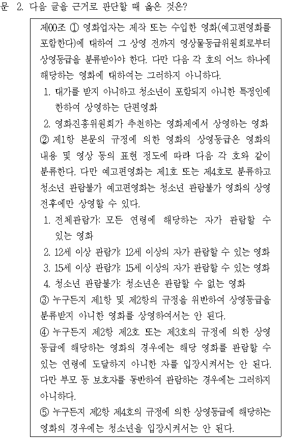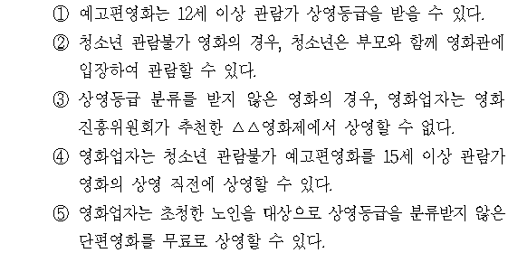 문제 해설 ▷ 정답 ⑤ ①. (X) 제2항) 예고편영화는 제1호 또는 제4호로 분류되므로, 제2호에 해당하는 12세 이상 관람가 상영등급을 받을 수 없다. ②. (X) 제5항) 청소년 관람불가 영화는 제2항 제4