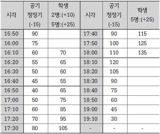 | 15시 50분 현재, A학교의 교실에는 아무도 없었고 켜져 있는 공기청정기가 나타내는 교실 내 미세먼지 양은 90이었다. 16시 정각에 학생 두 명이 교실에 들어와 공부를 시작하였고, 40분 후 학생 세 명이 더 들어와 공부를 시작하였다. 학생들은 모두 18시 정각에 교실에서 나왔다. |
