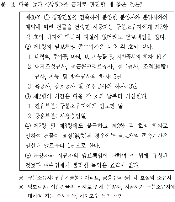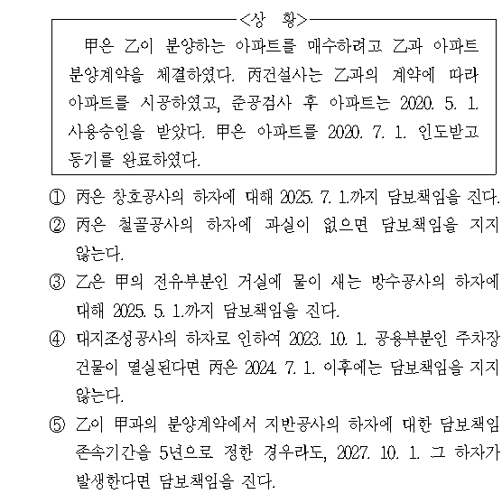 문제 해설 ▷ 정답 ⑤ ①. (X) 제2항) 창호공사의 하자는 제2항 제3호에 해당하는 하자로써 담보잭임 존속기간은 3년이다. 따라서 창호공사가 전유부분인지 공 유부분인지 몰라 2020. 5. 1.과 2020. 7. 1
