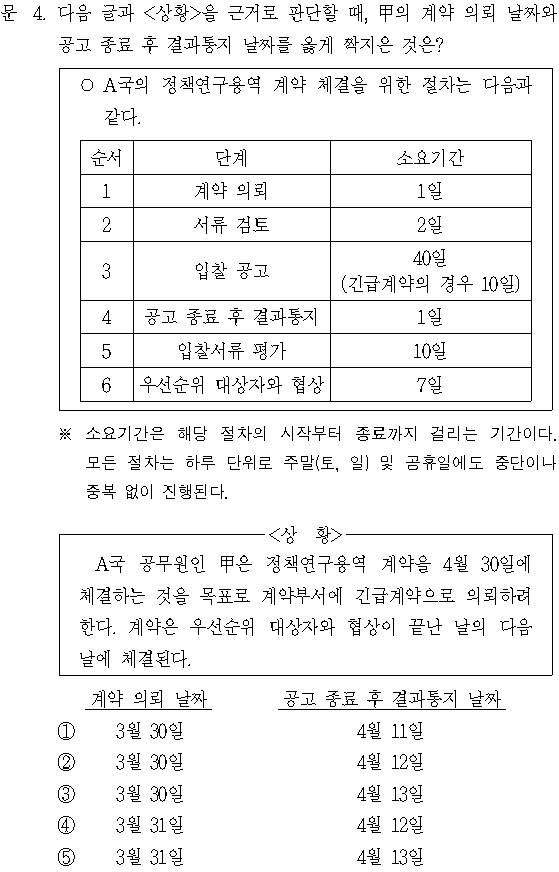 계약은 우선순위 대상자와 협상이 끝난 날의 다음 날에 체결하므로 4월 30일에 계약을 체결하려면 우선순위 대상자와 협상은 4월 29일에 끝나야 한다. 소요기간을 고려해 각 단계의 날짜를 구해보면 다음과 같다.