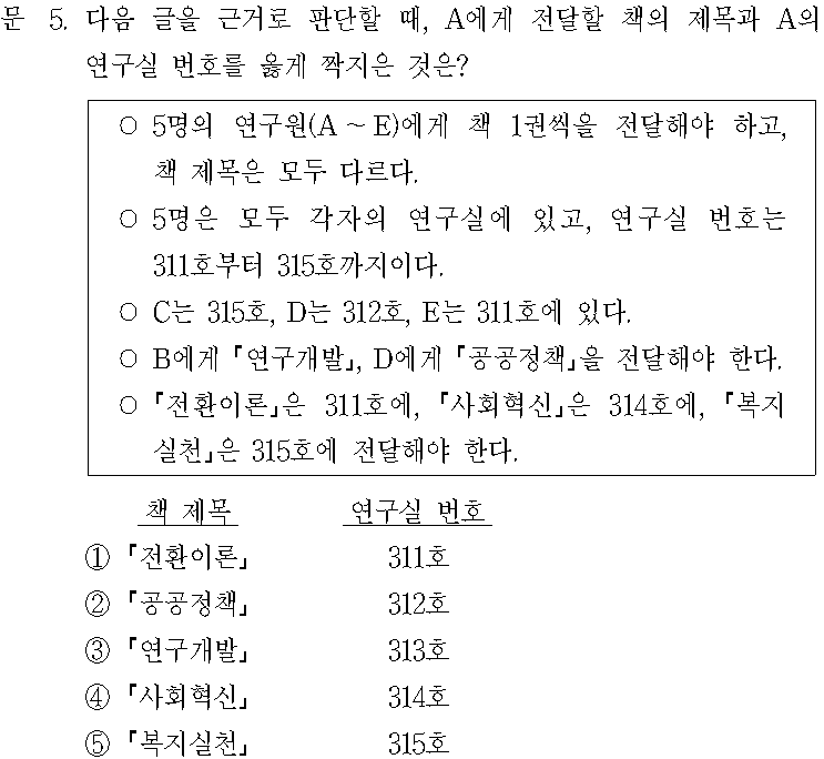 첫 번째 조건에서 5명의 책 제목이 모두 다름을 토대로 네 번째 조건을 고려하면, B에게 「연구개발」을 전달해야 하므로 적어도 A는 「연구개발」은 아니다. 따라서 선지 ③번을 제외한다.
