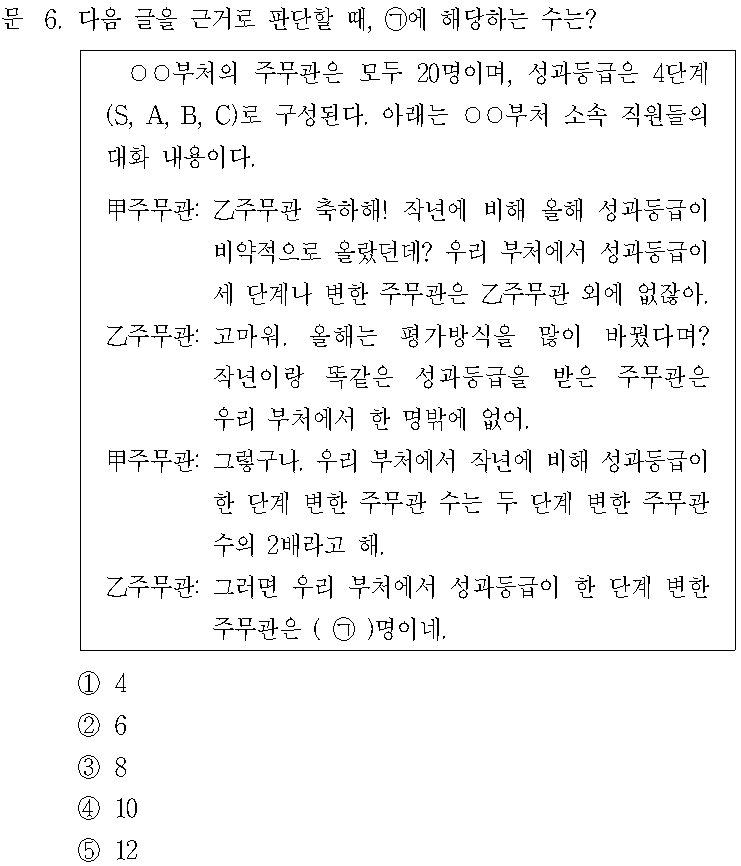 乙주무관의 첫 번째 대화에서 작년이랑 똑같은 성과등급을 받은 주무관은 우리 부처에서 한 명밖에 없다고 하였으므로 0단계 변경이 된 사람도 1명뿐이다.