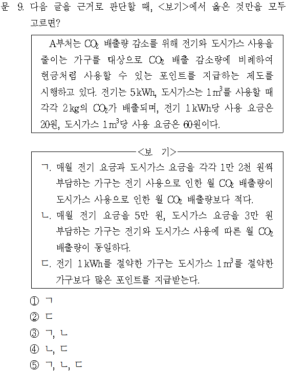 사용량을 고려해 CO2 배출량을 구해보면, 전기 사용으로 인한 월 CO2 배출량은 1,000kg, 도시가스 사용으로 인한 월 CO2 배출량도 1,000kg 이므로 전기와 도시가스 사용에 따른 월 CO2 배출량은 동일하다.