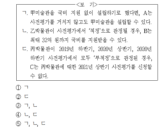지방자치단체가 동일한 공립 박물관 · 미술관 설립에 대해 3회 언속으로 사전평가를 신청하여 모두 ‘부적정’으로 판정받았다면, 그 박물관 · 미술관 설립에 대해서는 향후 1년간 사전평가 신청이 불가능하다. 사전평가가 연 2회 진행됨을 고려했을 때, 丙박물관이 3회 언속으로 ‘부적정’으로 판정을 받았으므로 향후 1년 이내인 2021년 상반기 사전평가를 신청할 수 없다.