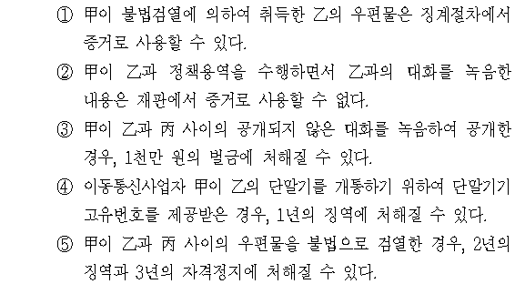 문제 해설 ▷ 정답 ⑤ ①. (X) 두 번째 조) 불법검열에 의하여 취득한 우편물은 재판 또는 징계절차에서 증거로 사용할 수 없다. ②. (X) 첫 번째 조 제1항, 두 번째 조) 녹음 또는 청취하지 못하