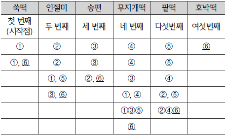 마지막으로 먹는 떡은 6개가 놓여있을 때를 기준으로 할 때 시작점에서 시계방향으로 떡을 세어 세 번째 위치에 있는 떡(네 번째)이 된다. 또한, 다섯 번째로 먹은 떡의 바로 앞에 위치한 떡이 된다.