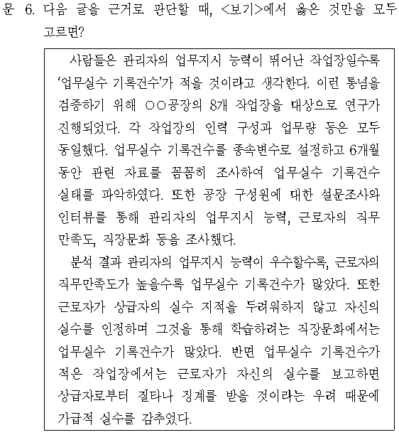 문제 해설 ▷ 정답 ④ ㄱ. (X) 문단2) 근로자가 실수를 통해 학습하려는 직장문화에서는 업무실수 기록건수가 많았다는 것을 통해 업무실수 기록건수가 많은 작업장에서는 실수를 통해 학습하