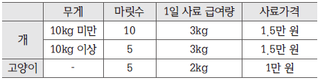 □□시가 관할구역 내 동물보호센터에 지급하는 경비는 사료비와 인건비가 있고, 여기서 보호비를 공제하므로 이를 각각 구해본다.