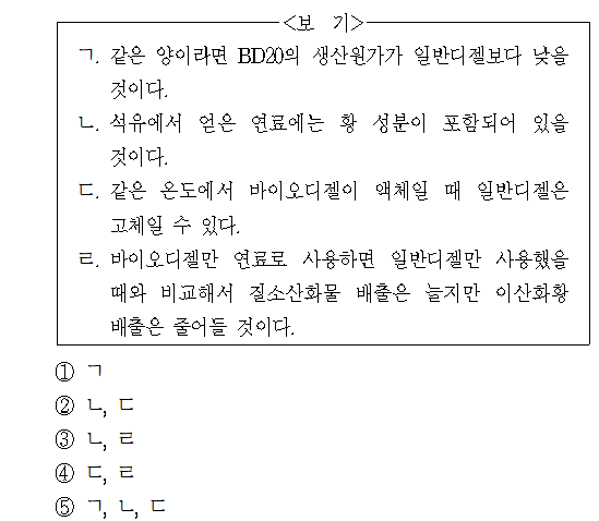 석유에서 얻는 연료와 달리 식물성 기름에는 황이 거의 들어 있지 않음을 고려하면, 석유에서 얻은 연료에는 황 성분이 포함되어 있음을 알 수 있다.