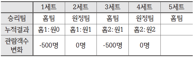 따라서 다음과 같이 경기결과가 나올 때 5세트가 시작한 시점에 경기장에 남아 있는 관람객 수가 가장 많을 수 있다.