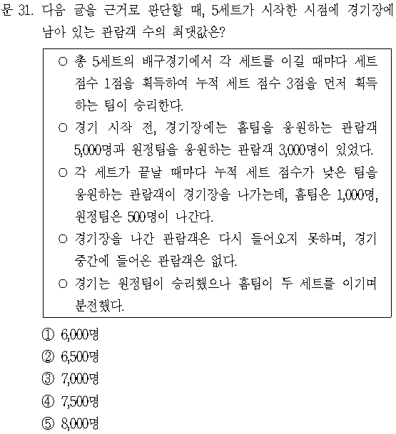 경기 시작 전, 관람객은 총 8,000명 있었고, 4세트까지 1,000명이 나갔으므로 5세트가 시작한 시점에 경기장에 남아 있는 관람객 수의 최댓값은 7,000명이다.