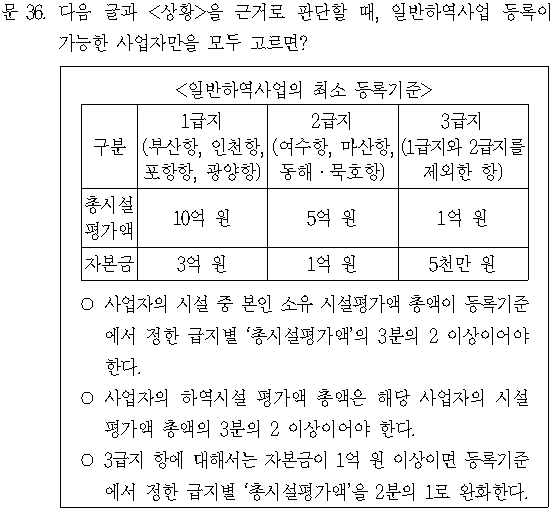 문제 해설 ▷ 정답 ④ 甲은 ‘부산항’이므로 1급지에 해당하고, 1급지의 ‘총시설평가액’은 10억 원이다. 한편, 甲의 사업자의 시설 중 본인 소유 시설평가액 총액은 B와 C의 시설평가액 총액인