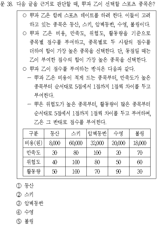 문제 해설 ▷ 정답 ① 각 기준별로 종목마다 점수를 부여하면 다음과 같다. (단, 위험도와 활동량은 왼쪽 칸이 甲, 오른쪽 칸이 乙의 점수를 나타낸다.) 총합이 가장 높은 종목은 등산, 암벽등반,