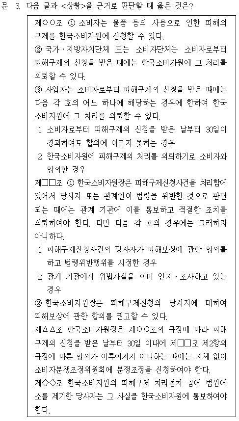 문제 해설 ▷ 정답 ① ①. (O) 제○○조 제3항) 제1호에 따라 소비자(甲)로부터 피해구제의 신청을 받은 날부터 30일이 경과하여도 합의에 이르지 못하는 경우, 사업자(乙)는 한국소비자원에 그 처