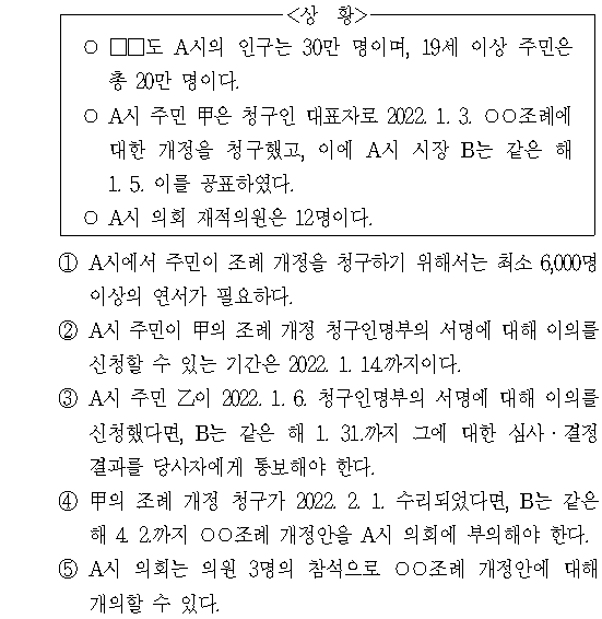 문제 해설 ▷ 정답 ② ①. (X) 문단1) □□도 A시는 시ㆍ군 및 자치구에 속하므로 지방자치단체에 조례의 제정ㆍ개정 및 폐지를 청구하기 위해서는 주민 총수의 50분의 1 이상의 연서가 필요하다.