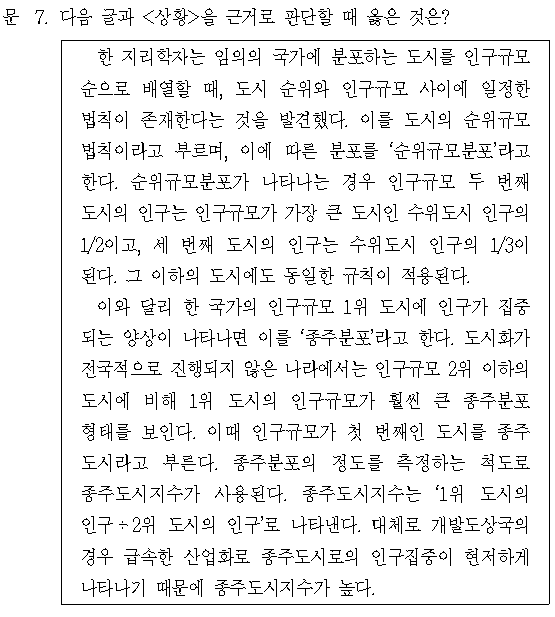 문제 해설 ▷ 정답 ① ○ 순위규모분포가 나타나는 경우 인구규모 두 번째 도시의 인구는 인구 규모가 가장 큰 도시인 수위도시 인구의 1/2이고, 세 번째 도시의 인구는 수위도시 인구의 1/3이다.