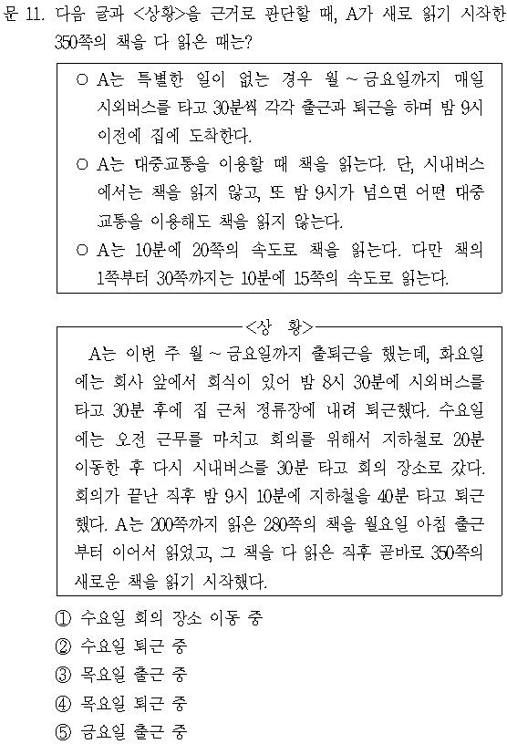 출근을 하면서 시외버스를 30분 동안 타고, 새로 읽기 시작한 350쪽의 책에서 151쪽부터 210쪽까지 읽는다. 오전 근무를 마치고 회의를 위해서 지하철로 20분 이동하고, 새로 읽기 시작한 350쪽의 책에서 211쪽부터 250쪽까지 읽는다. 지하철로 이동한 후 30분 간 시내버스를 탈 때는 책을 읽지 않는다(시외버스가 아니고 시내버스임에 유의). 또한, 퇴근이 밤 9시 10분 이후에 이뤄졌으므로 퇴근 시의 지하철 40분 동안에도 책을 읽지 않는다.