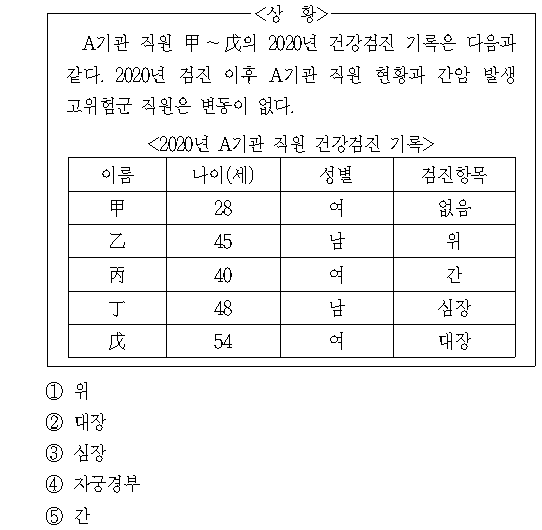 문제 해설 ▷ 정답 ② 의 A기관 직원들 나이는 모두 2020년 기준이므로, 2022년을 기준으로 나이를 계산하면 甲은 30세, 乙은 47세, 丙은 42세, 丁은 50세, 戊는 56세가 된다. ① 위 40세 이상이 대상이므