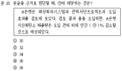 도입 전의 이산화탄소 배출량은 2,000톤이고, 화상회의시스템과 전력차단프로젝트를 도입하여 감소하는 이산화탄소 배출량은 108톤과 652톤의 합인 760톤이다. 따라서 A은행 이산화탄소 배출량은 도입 전에 비해 연간 38% 감소할 것이다.