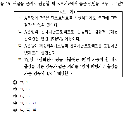 문단2, 3) 화상회의시스템을 활용할 경우에 한 사람의 이산화탄소 평균 배출량은 항공 출장의 1/10 수준에 불과하므로 40kg이다. A은행은 항공 출장인원의 30%에게 항공 출장 대신 화상회의시스템을 활용하도록 할 계획이므로 1000명의 30%인 300명이 화상회의시스템을 활용하게 된다. 따라서 1명당 360kg이 절감되므로 이는 총 108,000kg=108톤이 감소한다.