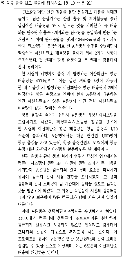문단5) 전력차단프로젝트를 통해 A은행은 연간 35만kWh의 전력소비를 절감할 수 있을 것으로 예상되는데 이는 652톤의 이산화탄소 배출에 해당하는 양이다.