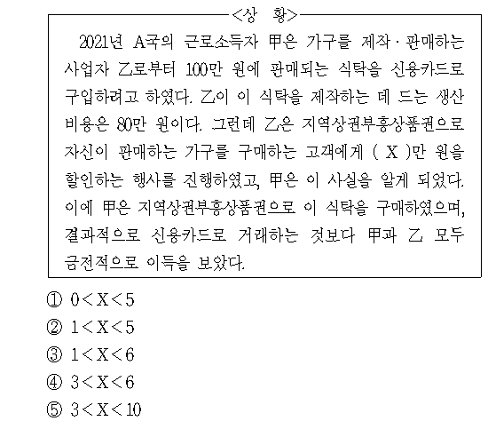 문제 해설 ▷ 정답 ② 지역상권부흥상품권을 통한 거래시 근로소득자와 사업자에게 각각 얼마 만큼의 금전적인 이득/손해가 발생하는지 구한 후, 그 사이에서 할인폭의 접점을 구한다. 甲 근로