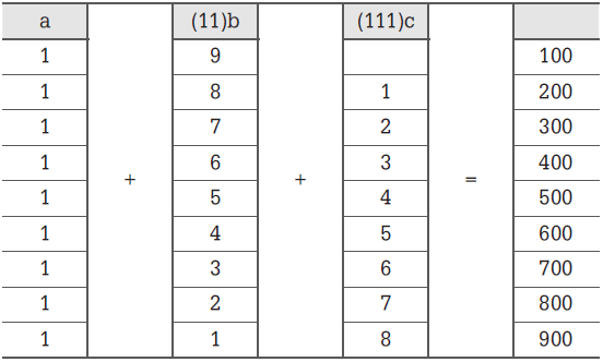 a, b, c 모두 최대 9까지만 존재하기 때문에 다른 경우는 만들 수가 없다. 예를 들어, c를 1로 줄이면 a+11b로 111을 만들 수는 없기 때문이다.