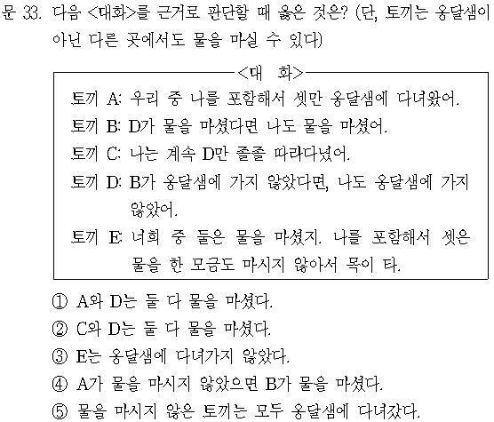 토끼 C의 대화에서 C와 D가 함께 움직였다는 것을 알 수 있으므로 옹달샘에 다녀온 토끼를 A, B, E로 정해본다(토끼 A의 대화에서 옹달샘에 다녀온 토끼는 3마리임을 알 수 있다). 그리고 토끼 B의 대화에 따르면, D가 물을 마셨다면 B도 물을 마셨어야 하므로 물을 마신 토끼를 B, D로 정해본다. 이 경우가 모순 없이 성립하므로 E가 옹달샘을 다녀간 반례가 존재한다.