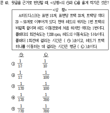 문제 해설 ▷ 정답 ② ①. (X) 문단1) 플래터의 양면은 각각 ‘표면’이라 불리우므로, 플래터가 5개일 때 표면의 개수는 최대 10개일 수 있다. ②. (O) 문단4) 플래터 표면 중심에서 거리가 같은 모