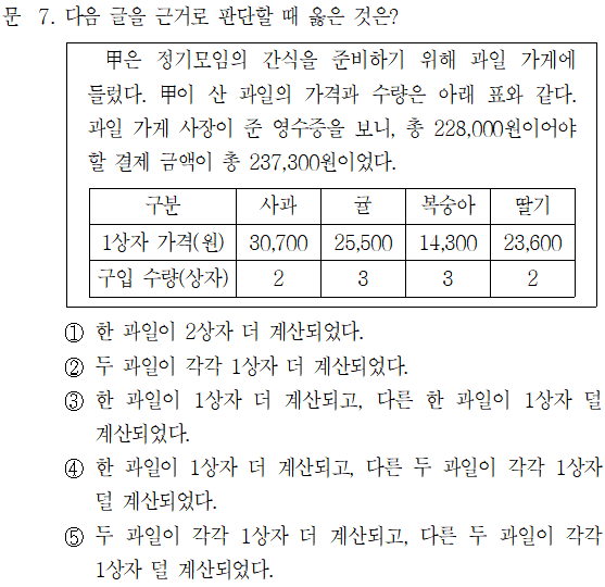 문제 해설 ▷ 정답 ③ 원래 결제 금액인 228,000원과 잘못 결제된 금액인 237,300원 간의 차액은 9,300원이다. 따라서 선지 중에서 9,300원만큼 차이가 날 수 있는 상황을 선택하면 된다. 복숭아 1상자의