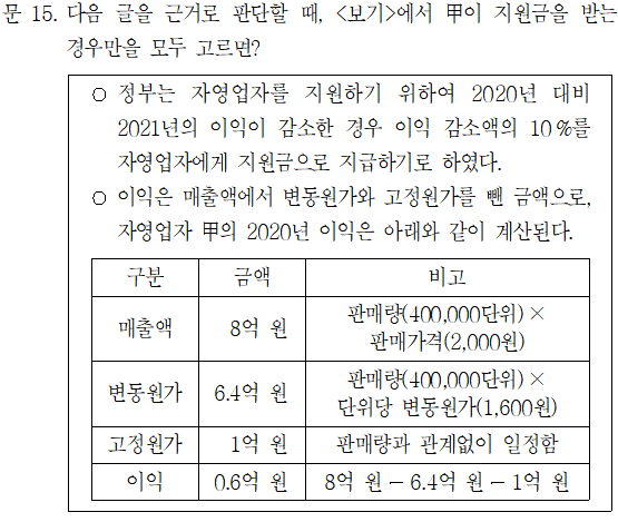 판매가격만 5% 인하하였다면 매출액만 감소한다. 따라서 이익도 감소하므로 지원금을 받는 경우에 해당한다.
