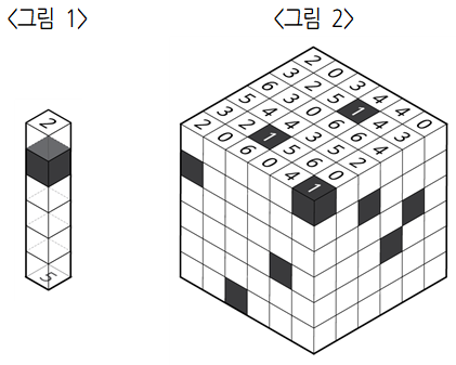 | 정육면체인 하얀 블록 5개와 검은 블록 1개를 일렬로 붙인 막대를 30개 만든다. 각 막대의 윗면에는 가장 위에 있는 블록부터, 아랫면에는 가장 아래에 있는 블록부터 세어 검은 블록이 몇 번째 블록인지를 나타내는 숫자를 쓴다. 이런 규칙에 따르면 <그림 1>의 예에서는 윗면에 2를, 아랫면에 5를 쓰게 된다. 다음으로 검은 블록 없이 하얀 블록 6개를 일렬로 붙인 막대를 6개 만든다. 검은 블록이 없으므로 윗면과 아랫면 모두에 0을 쓴다. 이렇게 만든 36개의 막대를 붙여 <그림 2>와 같은 큰 정육면체를 만들었더니, 윗면에 쓰인 36개 숫자의 합이 109였다. ![]() |