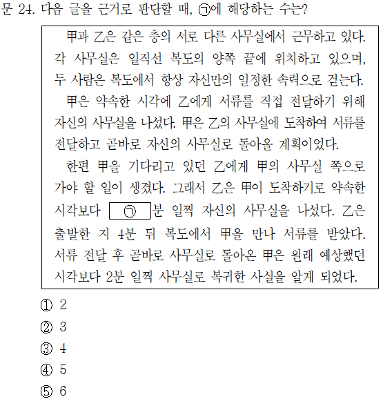 문제 해설 ▷ 정답 ④ 甲은 원래 乙의 사무실까지 갔어야 하지만 그보다 일찍 乙을 만나게 되었다. 따라서 乙을 만난 장소부터 乙의 사무실까지의 거리를 왔다갔다 하지 않게 되었고, 그 시간은