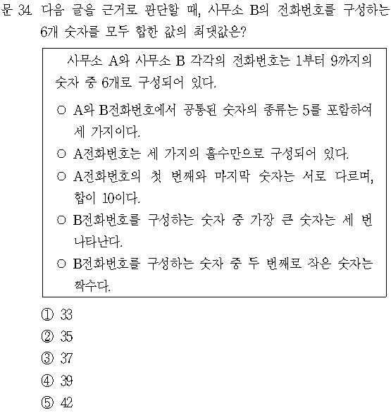 두 번째 조건과 세 번째 조건을 조합해서 고려하면, 9와 1, 7과 3이 가능함을 알 수 있다. 한편, B의 전화번호를 구성하는 6개 숫자를 모두 합한 값의 최댓값을 구해야 하는 목표, A전화번호를 구성하는 세 가지의 홀수는 모두 B전화번호에도 공통된다는 점, B전화번호를 구성하는 숫자 중 가장 큰 숫자는 세 번 나타난다는 점을 고려했을 때, 7과 3 조합보다는 9와 1 조합을 사용하는 것으로 결정할 수 있다. 따라서 B전화번호를 구성하는 숫자에는 9, 5, 1이 포함되고, 그 중에서 9는 세 번 사용된다.