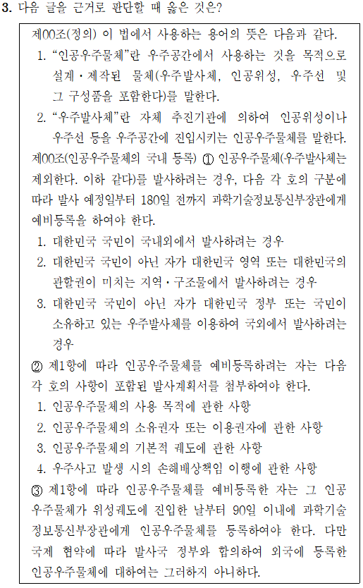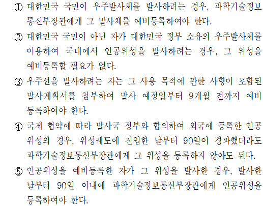 문제 해설 ▷ 정답 ④ ①. (X) 두 번째 조 제1항) 대한민국 국민이 인공우주물체를 발사하려는 경우(제1호), 과학기술정보통신부장관에게 그 발사체를 예비등록하여야 하는 것은 맞지만 그 인공우