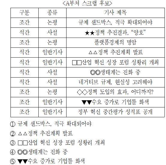 문제 해설 ▷ 정답 ⑤ (1) 조건 1의 단서에 따라 ‘△△정책’이 제목에 포함된 기사인 ‘△△정책 추진계획 발표’는 스크랩에서 제외한다. (2) 조건 1에 따라 ‘정책’이라는 단어가 포함된 기