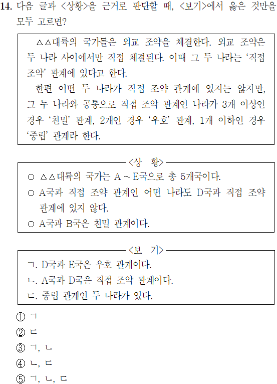 (2) A국과 직접 조약 관계인 어떤 나라도 D국과 직접 조약 관계가 아니므로 C국과 E국은 D국과 직접 조약 관계가 아니다.