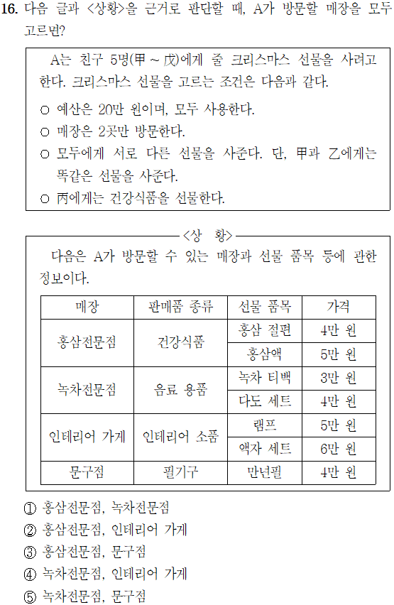 문제 해설 ▷ 정답 ① (1) 丙에게 건강식품을 선물하기 위해 홍삼전문점은 반드시 포함되어야 하므로, 선지 4번과 5번을 소거한다. (2) 친구 5명 중 甲과 乙에게는 똑같은 선물을 사주더라도 모두