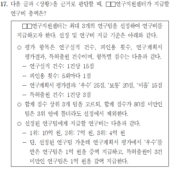 [5급 공채 (행정고시)/2023년 가책형] - [23행(가)-17해] 2023년 5급 공채 (행정고시) PSAT 상황판단 가책형 17번 해설
