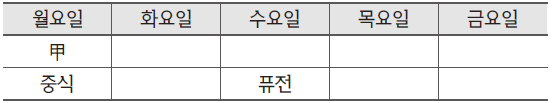 4) 乙은 목과 금만 가능하므로 금요일로 확정되고, 나머지 수요일은 戊가 된다.