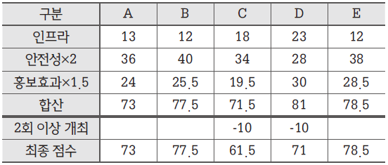 따라서 최종 점수가 높은 상위 2곳인 E와 B가 선정된다.