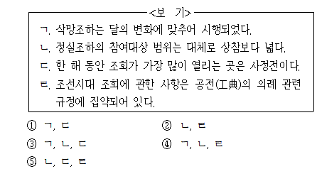 <표>의 위쪽과 아래쪽이 주어져 있을 때에는 <표> 아래쪽을 우선적으로 주목하도록 한다. 모든 경우에 그러한 것은 아니지만 중요한 정보의 경우 표의 하단부에 주어져있는 경우가 많다. 마지막 문단의 마지막 문장에 따르면 달의 변화를 기준으로 작성된 달력에 따라 매월 1일에 해당되는 삭일(朔日)과 보름달이 뜨는 망일(望日)에 시행되는 삭망조하가 존재하므로, 삭망조하가 달의 변화에 맞추어 시행되었다고 보는 선지는 옳다.