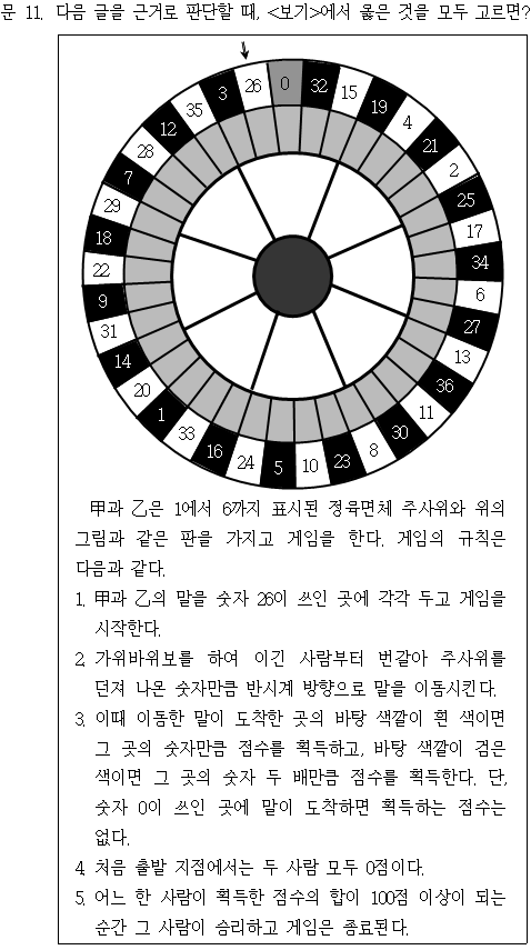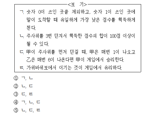 문제 해설 ▷ 정답 ⑤ ㄱ. (X) [반례] 우측 상단부에 흰색 2점이 존재하므로 숫자 1이 쓰인 곳에 말이 도착할 때 ‘유일하게’ 가장 낮은 점수를 획득하게 되는 것은 아니다. ㄴ. (O) [사례] 26에서 시
