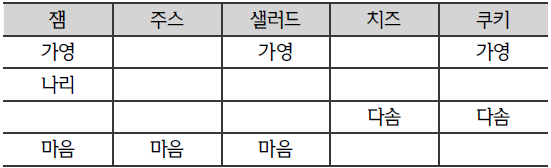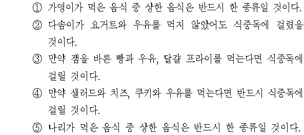 다솜이가 식중독에 걸렸으므로, 치즈와 쿠키 중 최소한 하나는 반드시 상한 음식에 해당한다. 따라서 샐러드와 치즈, 쿠키와 우유를 먹는다면 반드시 식중독에 걸릴 것이다.