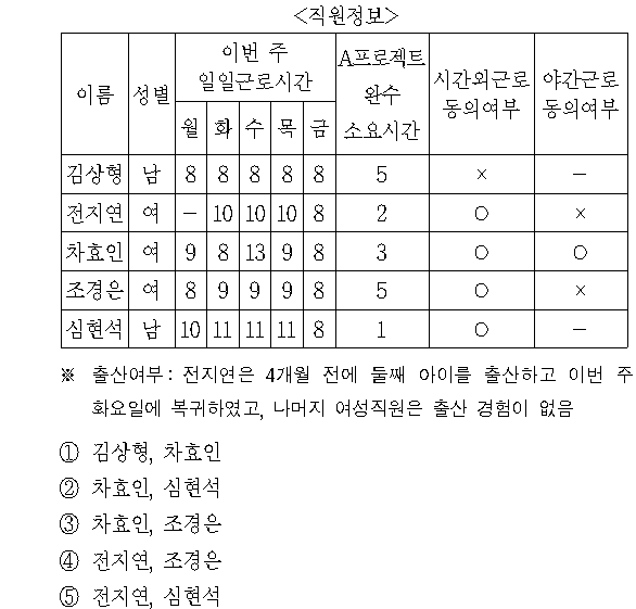 마지막으로 출산 이후 1년이 지나지 않은 여성에 대해서는 1일 2시간, 1주 6시간을 초과하는 시간 외 근로를 시키지 못한다. 각주에 따르면 전지연은 출산 이후 1년이 지나지 않은 여성에 해당하므로, 1일 2시간을 초과하는 시간 외 근로를 하지 못하나 프로젝트 완수에는 2시간이 소요되므로 이에는 위배되지 않는다. 다만, 1주 6시간을 초과하는 시간외 근로를 하였는지를 판단하여야 하는바, 전지연은 화요일부터 목요일까지 1일 8시간을 초과하여 2시간씩 3일간 시간외근로를 하였으므로 1주 6시간의 초과근로를 한 상태이다. 따라서 추가적인 시간외근로를 할 수 없으므로 프로젝트를 오늘 내에 완수할 수 있는 직원에 해당하지 않는다. 선지 ⑤를 소거한다.