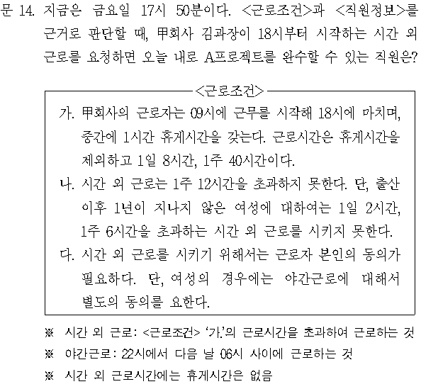 문제 해설 ▷ 정답 ② 18시부터 시간 외 근로를 하여 오늘 내로 A프로젝트를 완수할 수 있는 직원을 구해야 하므로 조건에 부합하지 않는 직원을 소거하여 답을 도출하면 된다. 에 주어진 각 항목