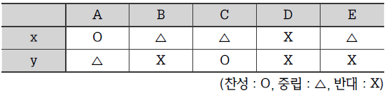 x, y 2가지 조항에 대한 5개 정당의 대표들의 태도가 정해지므로, 간단히 2변수 표를 그려 확인할 수 있다. (X와 Y를 찬성, 중립, 반대로 나누어 O/X로 표시하는 표를 그려도 좋다.)